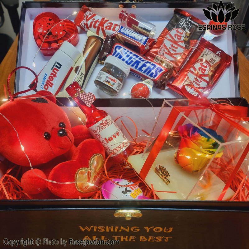 باکس ولنتاین با طراحی خاص و زیبا که شامل گل رز جاودان است، به همراه یک خرس کوچک ناز و مجموعهای از شکلاتهای خوشمزه و سایر متعلقات جذاب که در تصویر مشاهده میشود، در این بستهبندی شگفتانگیز قرار گرفته است. این مجموعه کامل، ایدهآل برای ابراز عشق است باکس ولنتاین با طراحی خاص و زیبا که شامل گل رز جاودان است، به همراه یک خرس کوچک ناز و مجموعهای از شکلاتهای خوشمزه و سایر متعلقات جذاب که در تصویر مشاهده میشود، در این بستهبندی شگفتانگیز قرار گرفته است. این مجموعه کامل، ایدهآل برای ابراز عشق و محبت در روز ولنتاین به شمار میرود.
