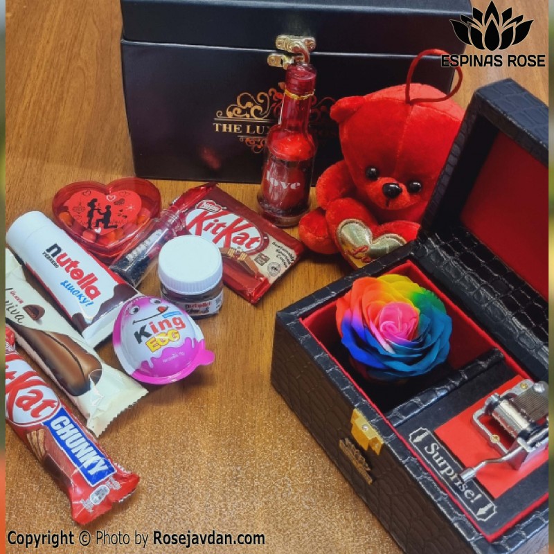 پک ولنتاین همراه باکس گل رز جاودان هفت رنگ موزیکال پایه سنگ و شکلات و خرس