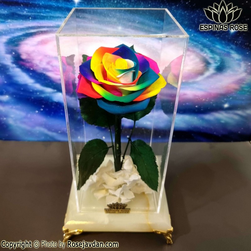 جزئیات گل رز جاودان هفت رنگ همراه ساقه و برگ طبیعی و جاودان
