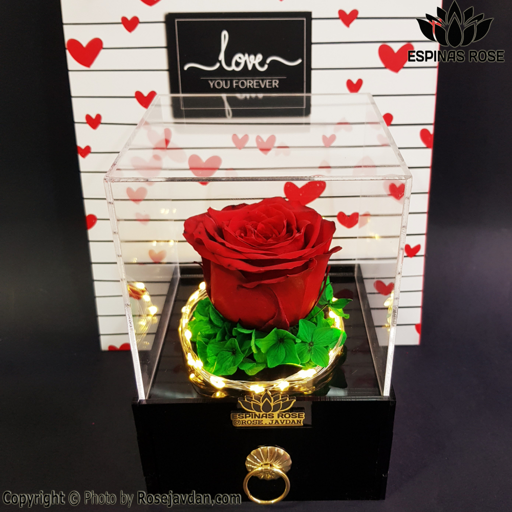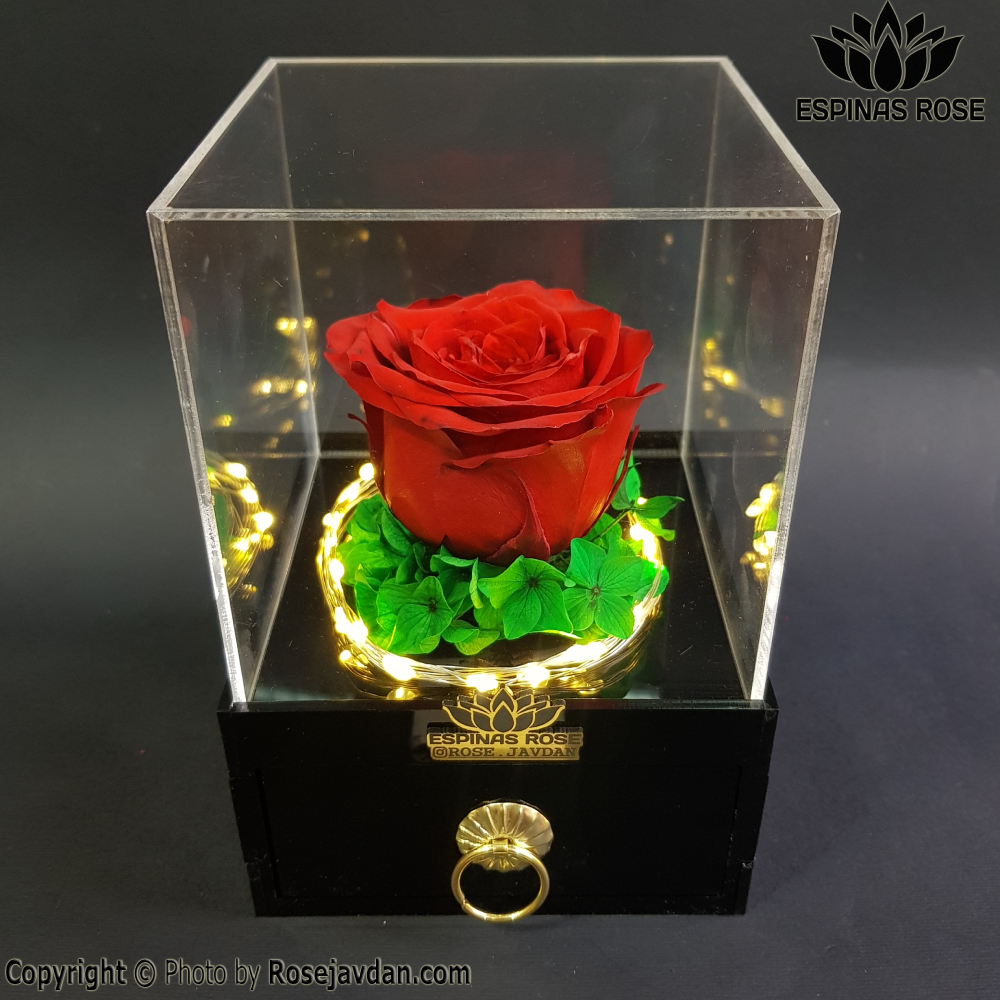 - مزایا در یک نگاه: دوام بالای رزهای جاودان، طراحی شفاف و جذاب پلکسی، محفظه مخفی کشویی برای سورپرایز، و نور LED که جلوه بصری را تقویت میکند.